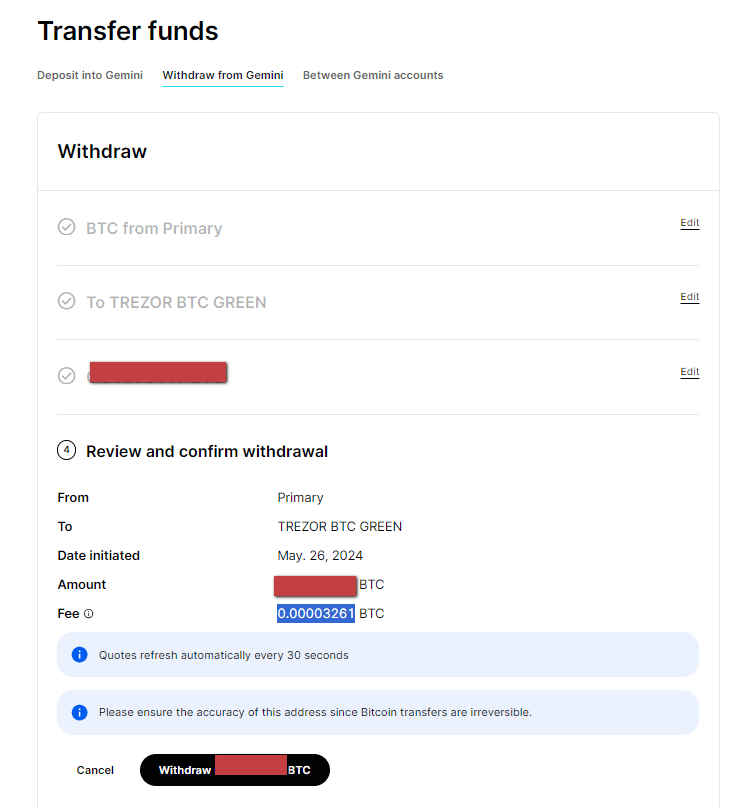For me, I would usually accumulate & send 1 million Satoshis to my wallet after buying Bitcoin on Gemini.
